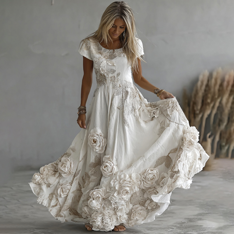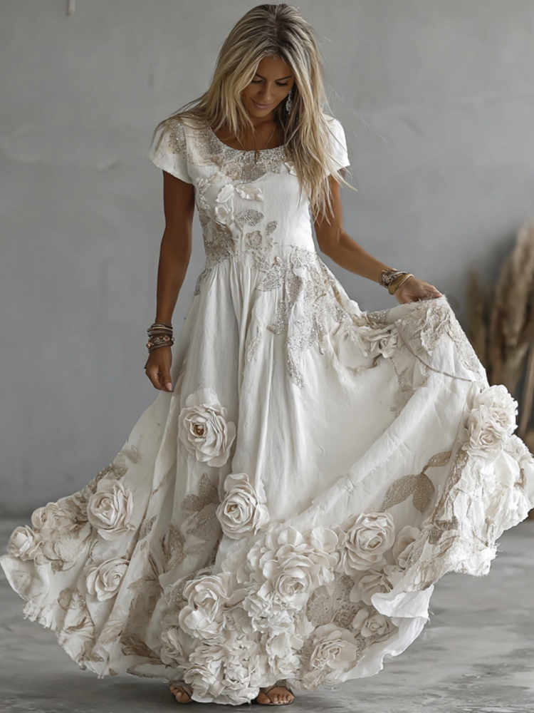 Women's Vintage White Rose Embroidery Art Round Neck Short Sleeve Maxi Dress