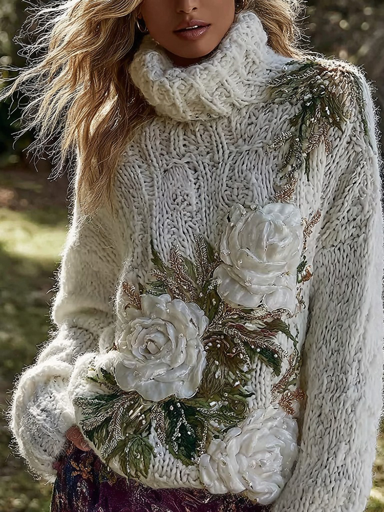 Women's Vintage White Rose Knitted Warm Turtleneck Sweater