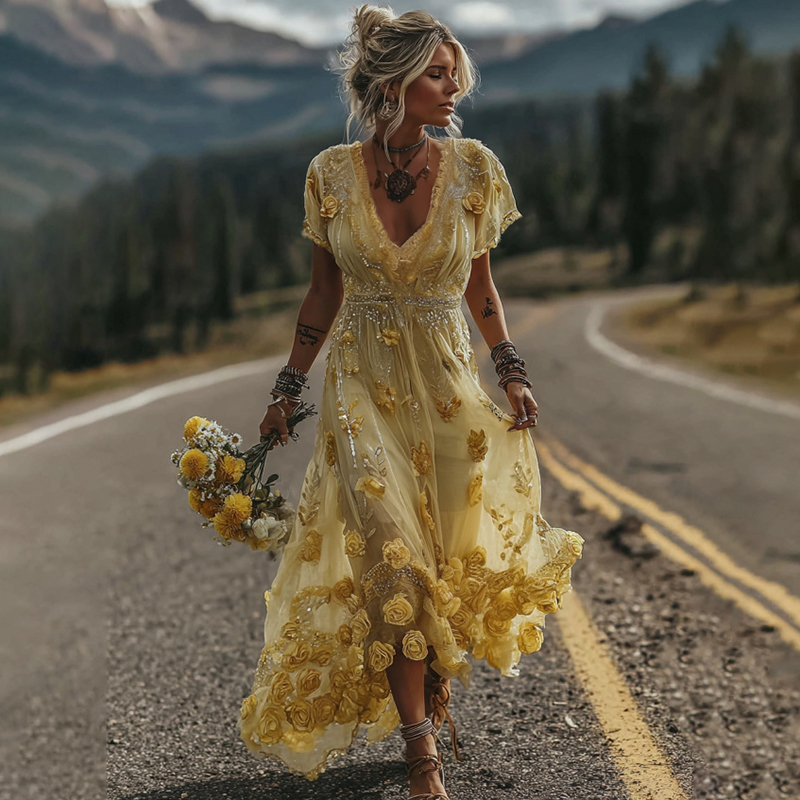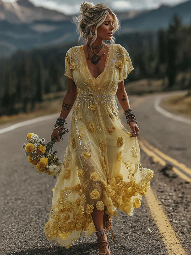 Women's Vintage Yellow Roses And Floral Art Print V-neck Midi Dress