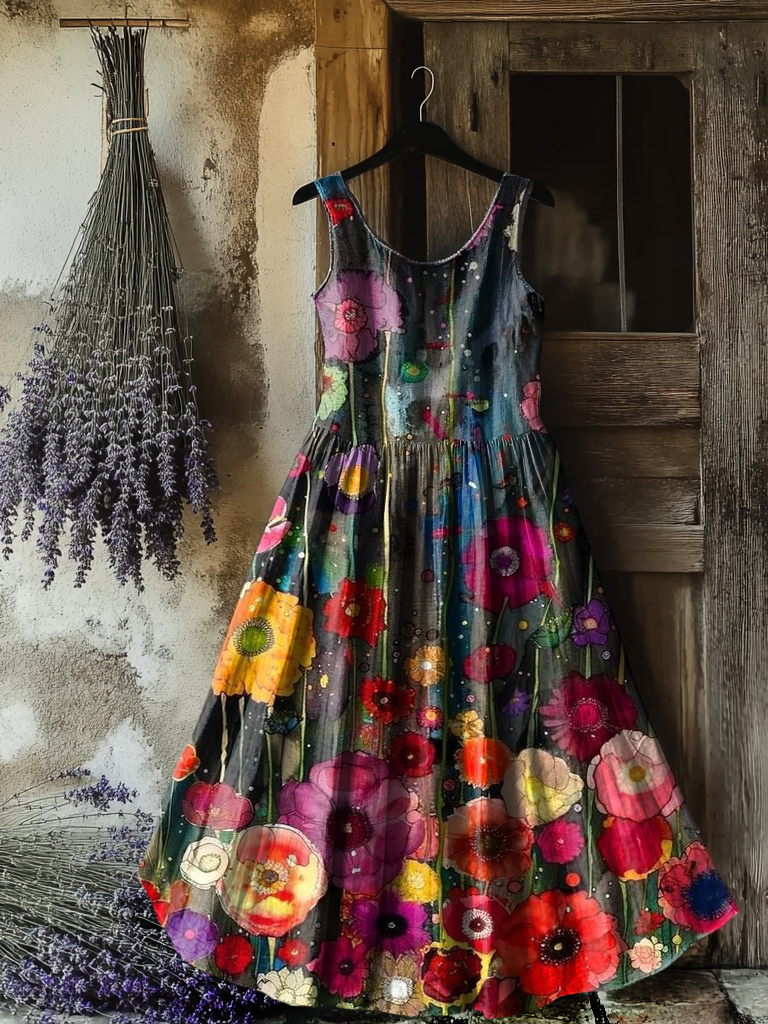 Women's Watercolor Floral Art Print Crew Neck Sleeveless Cotton Pocket Dress