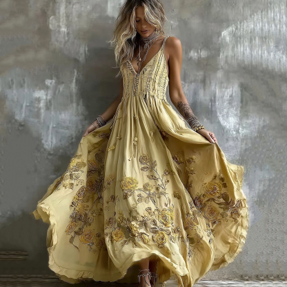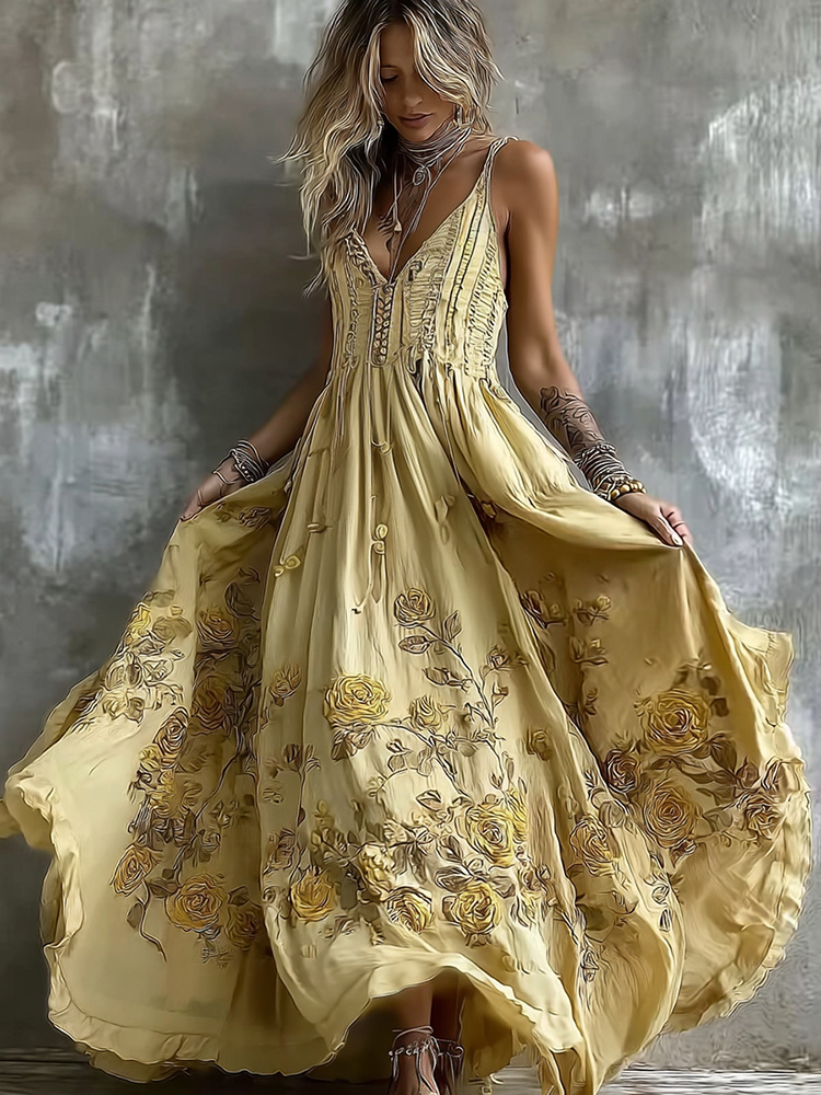 Women's Yellow Roses And Floral Art Print Suspenders Maxi Dress