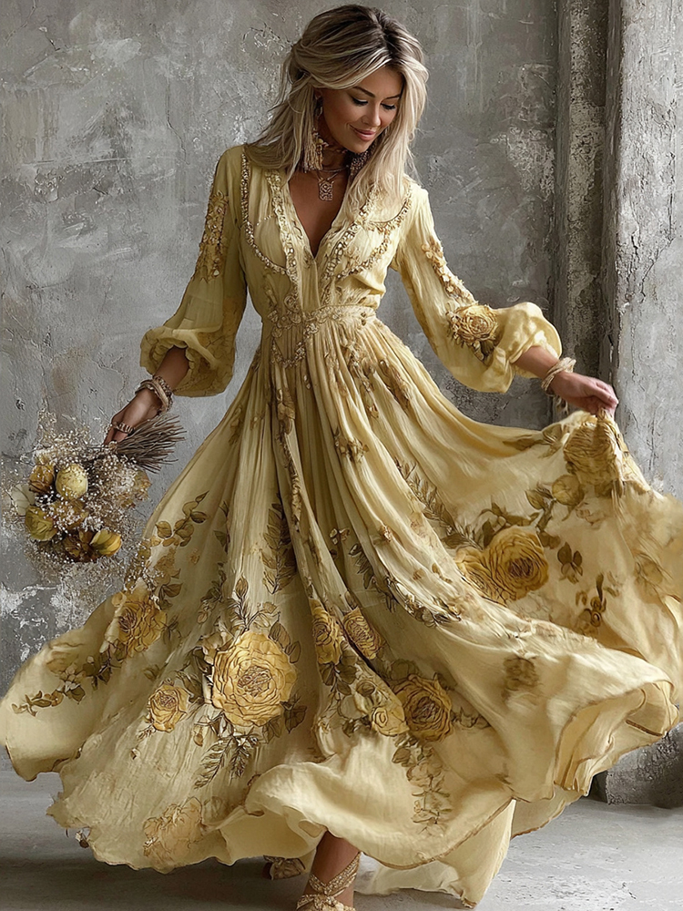 Women's Yellow Roses And Floral Art Print V-neck Long Sleeve Maxi Dress