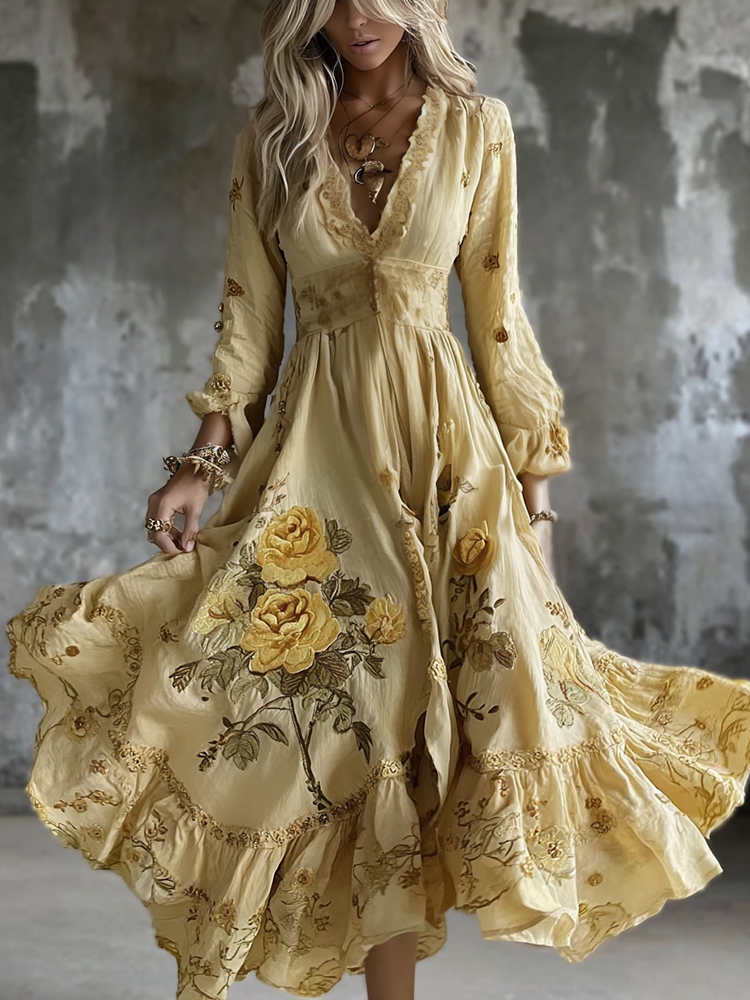 Women's Yellow Roses And Floral Art Print V-neck Long Sleeve Maxi Dress