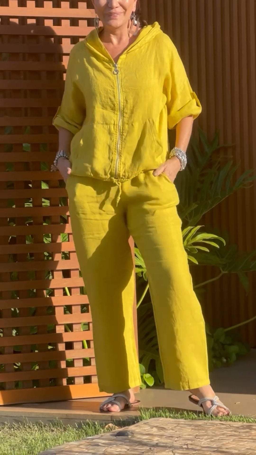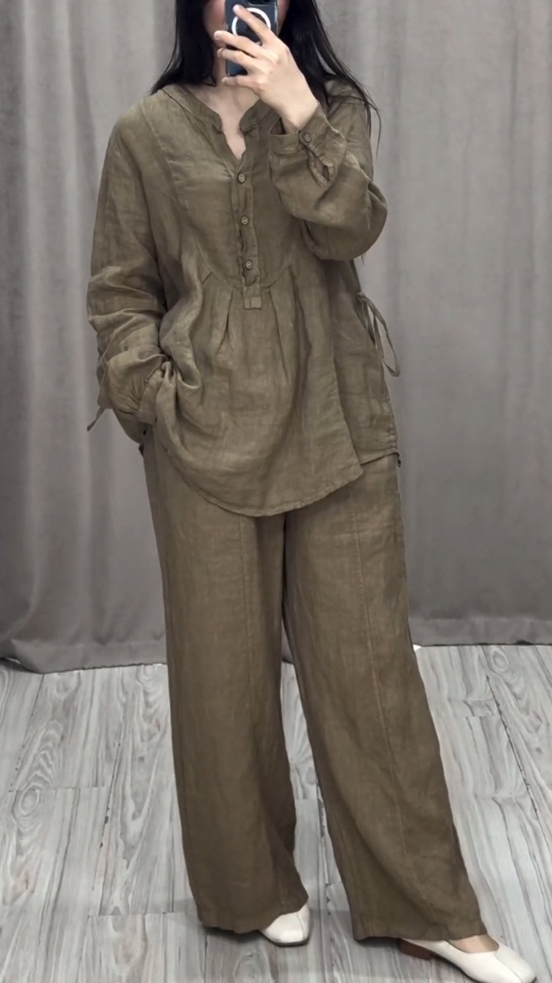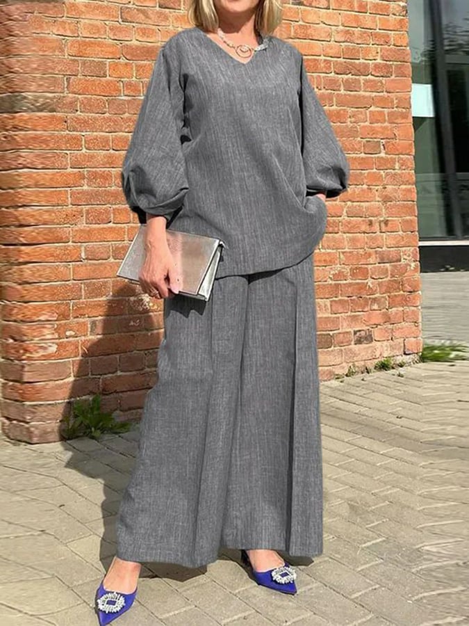 Women Cotton and Linen V-neck Two-piece Suit