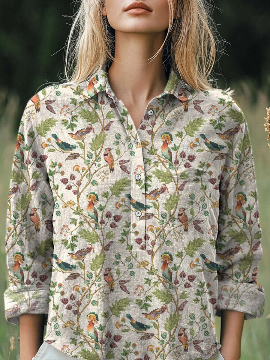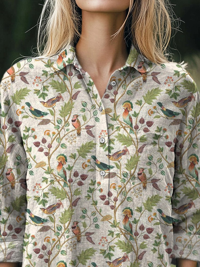 Lovely Spring Bird Pattern Printed Women's Casual Cotton And Linen Shirt