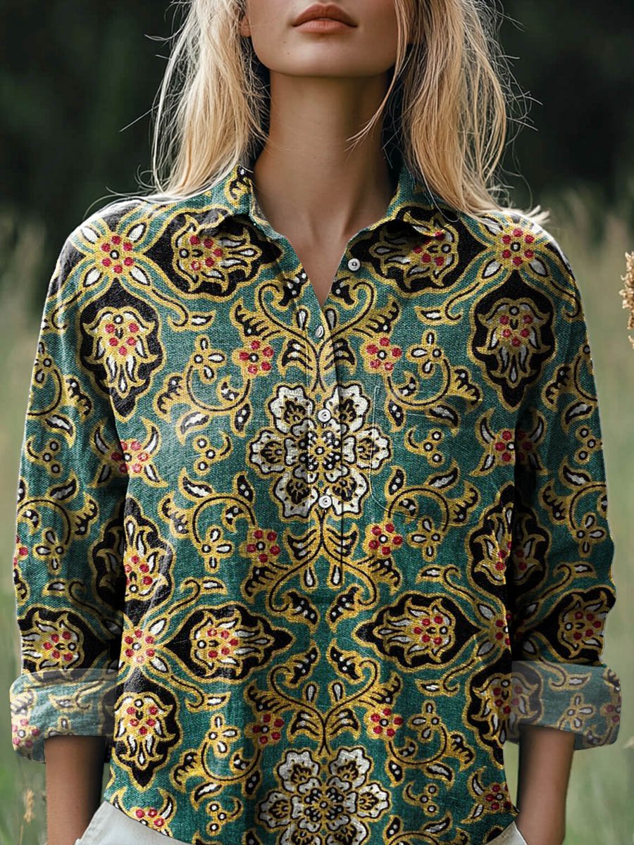 Women's Vintage Floral Art Print Casual Long Sleeve Comfortable Cotton Shirt