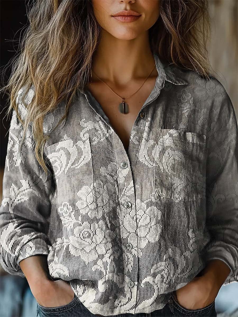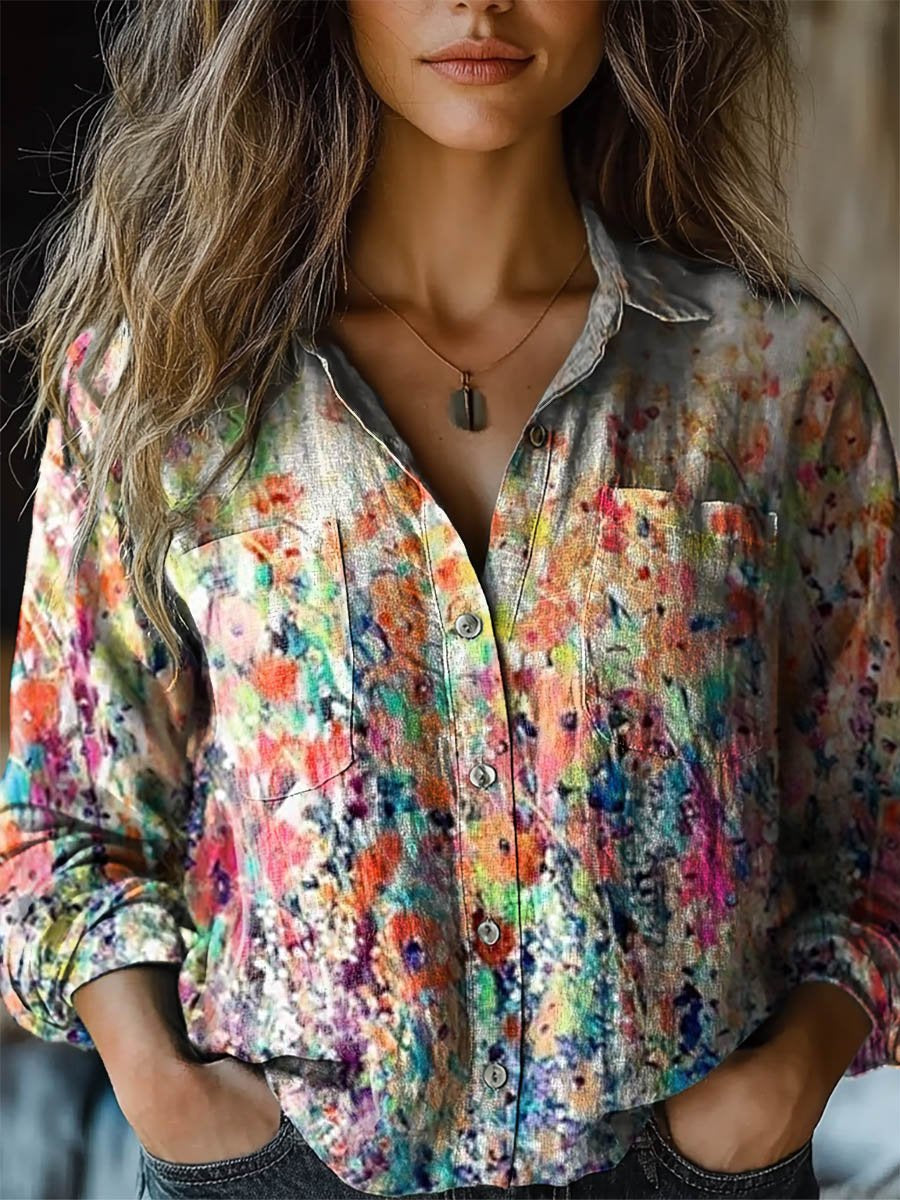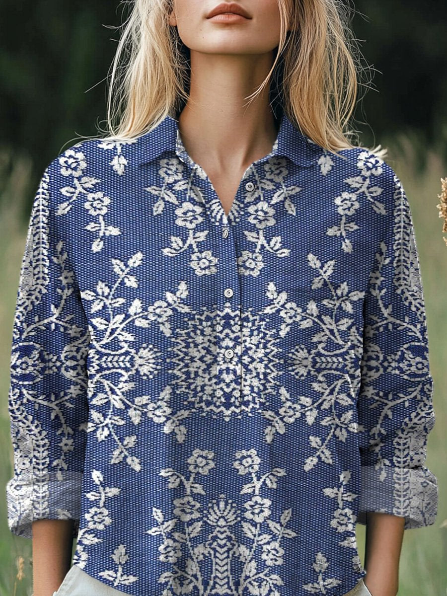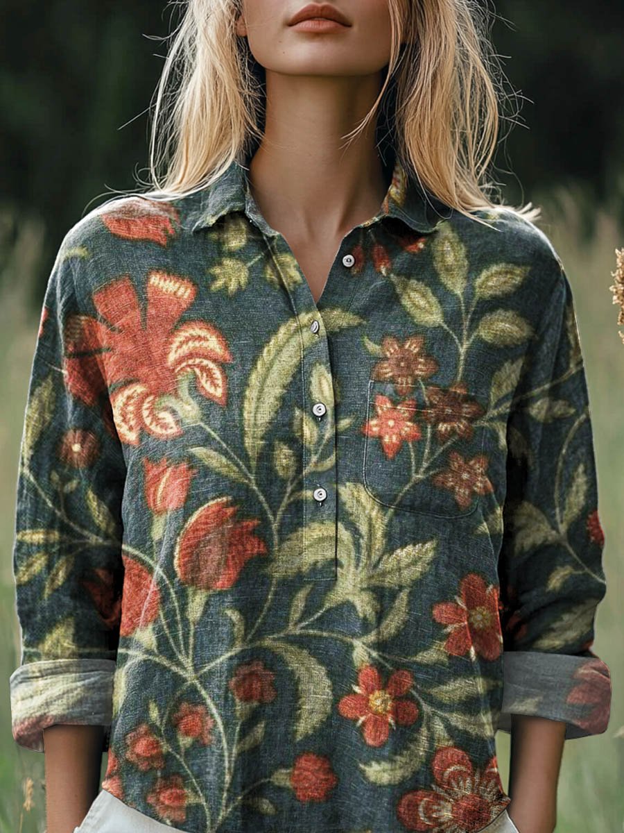 Women's Vintage Flower Art Print Casual Long Sleeve Comfortable Cotton Shirt