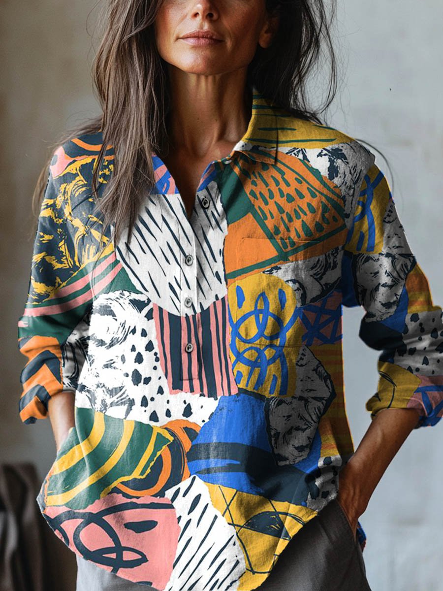 Women's Abstract Patchwork Pattern Art Print Casual Cotton And Linen Shirt