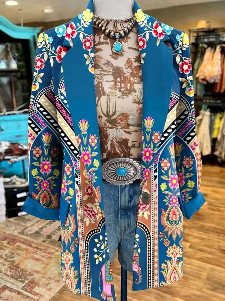 Women's Vintage Flower Contrast Print 3/4 Sleeve Casual Blazer