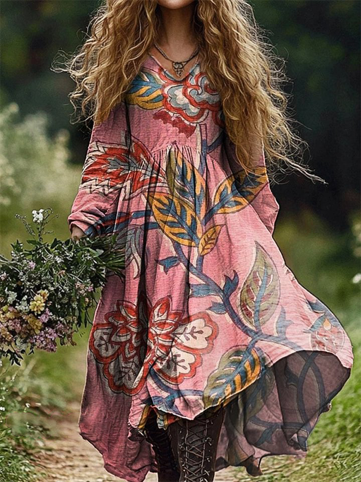 Women's Retro Paisley Floral Print Pocket V-neck Cotton Dress
