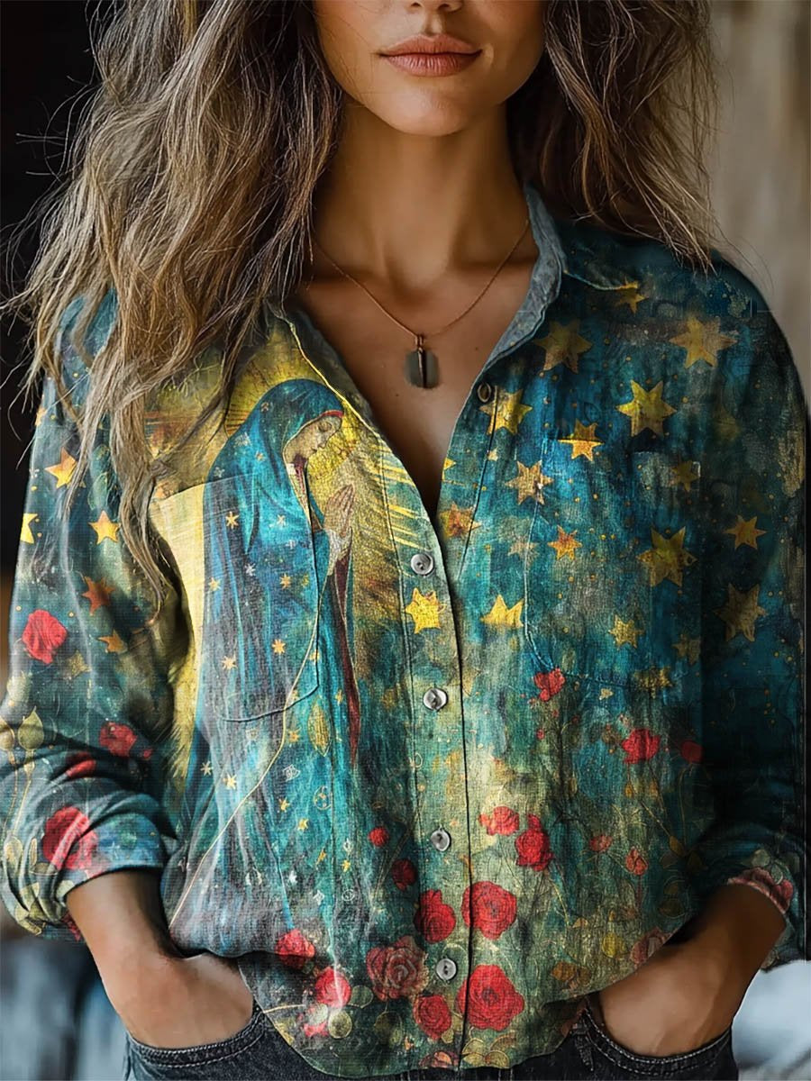 Women's Vintage Lovely Floral Mother Mary Art Print Casual Long Sleeve Comfortable Cotton Shirt