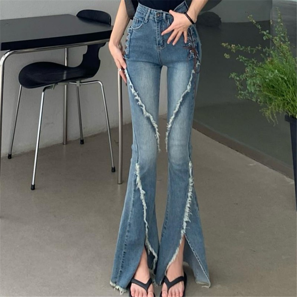 Women's Fashion Tassel Slit Retro Casual High Waist Micro Flare Pants