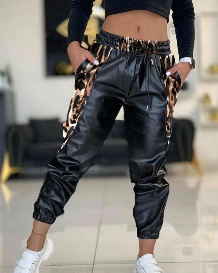 Women's Fashion Contrasting Color PU Leather Drawstring Casual Pants