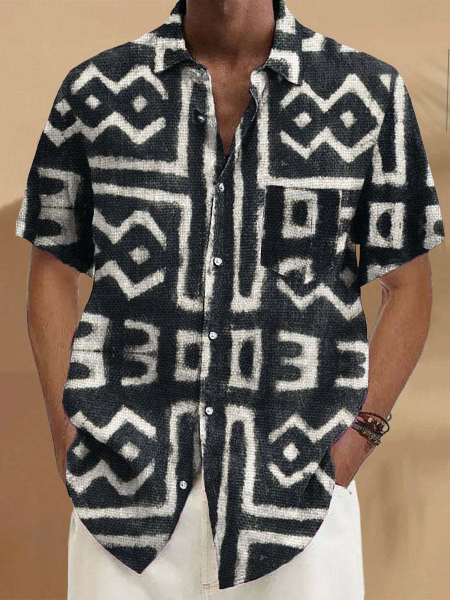 Gentleman Vintage Ethnic Geometric Art Print Short Sleeve Pocket Shirt