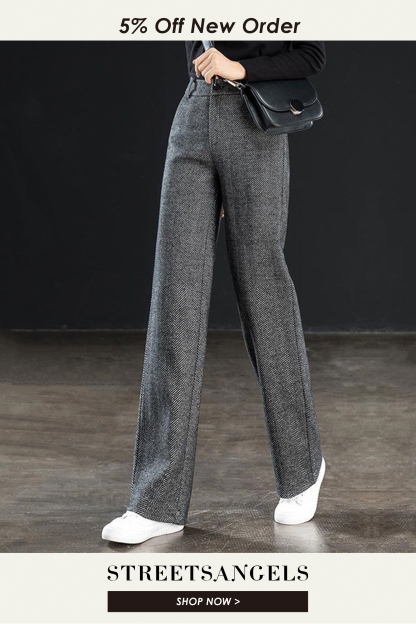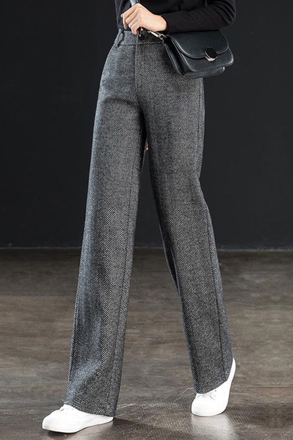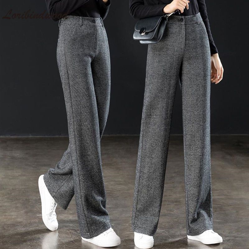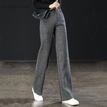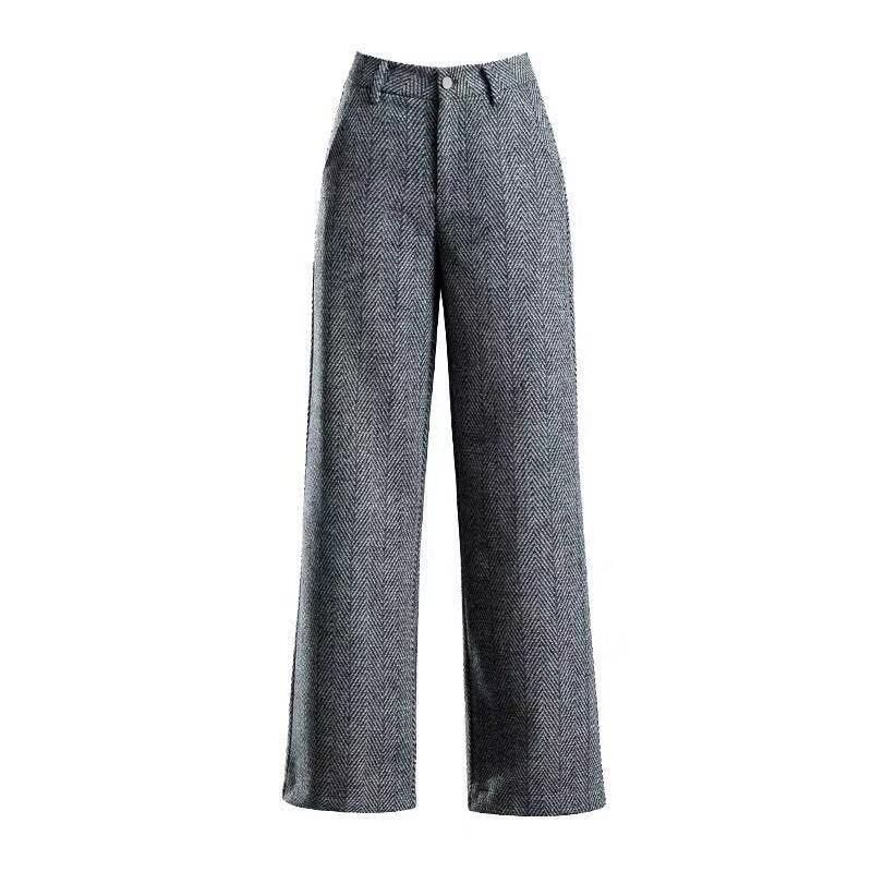 Herringbone Wool Fashion Solid High Waist Straight Wide Leg Pants