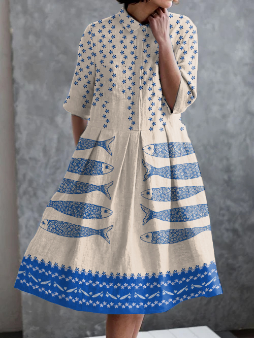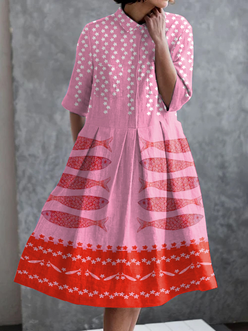 Holiday Floral Fish Print Casual Pocket Half Sleeve Dress