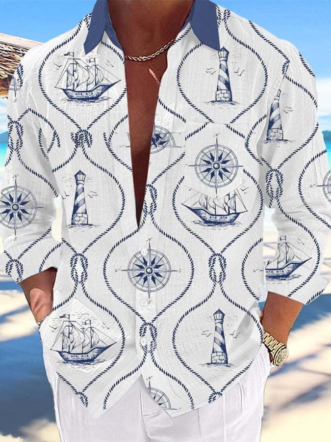 Men's Casual Nautical Lighthouse Print Lapel Shirt