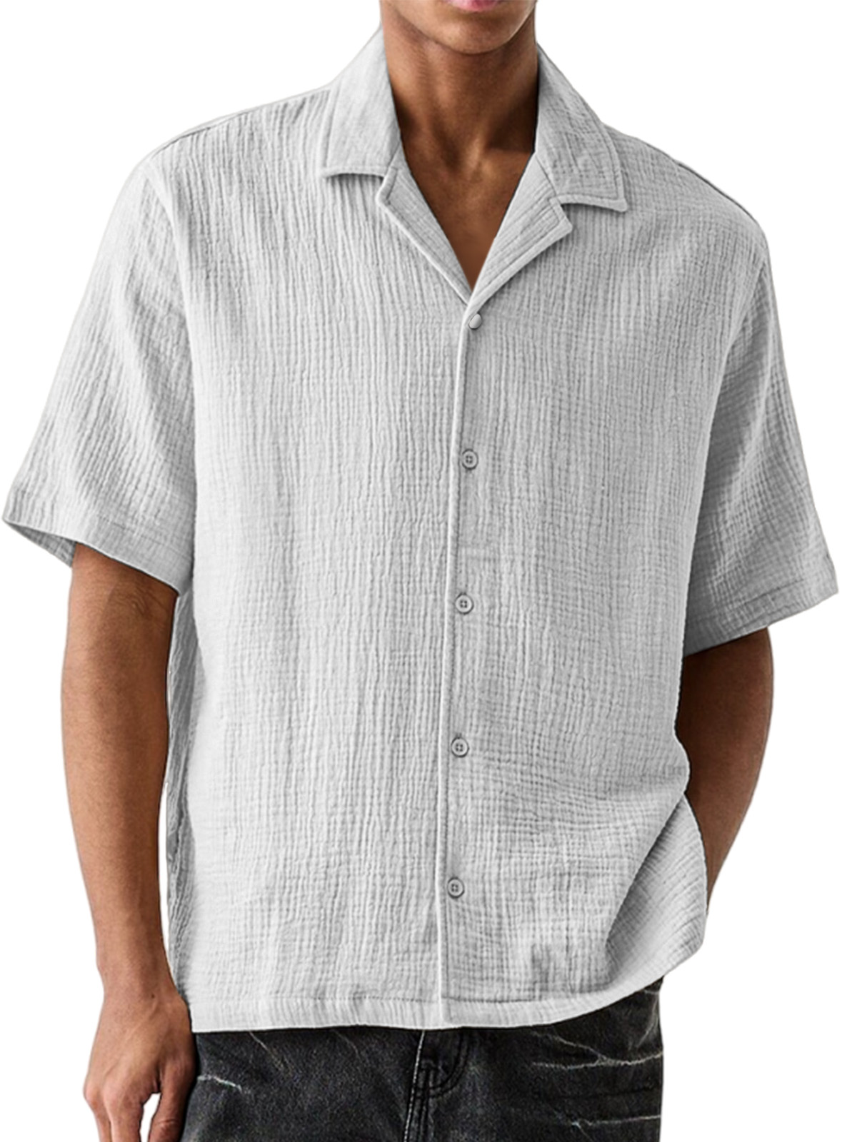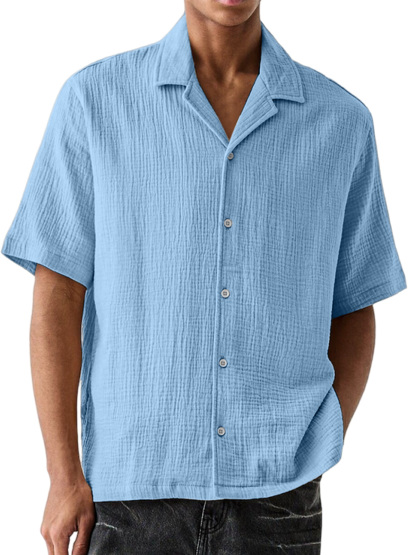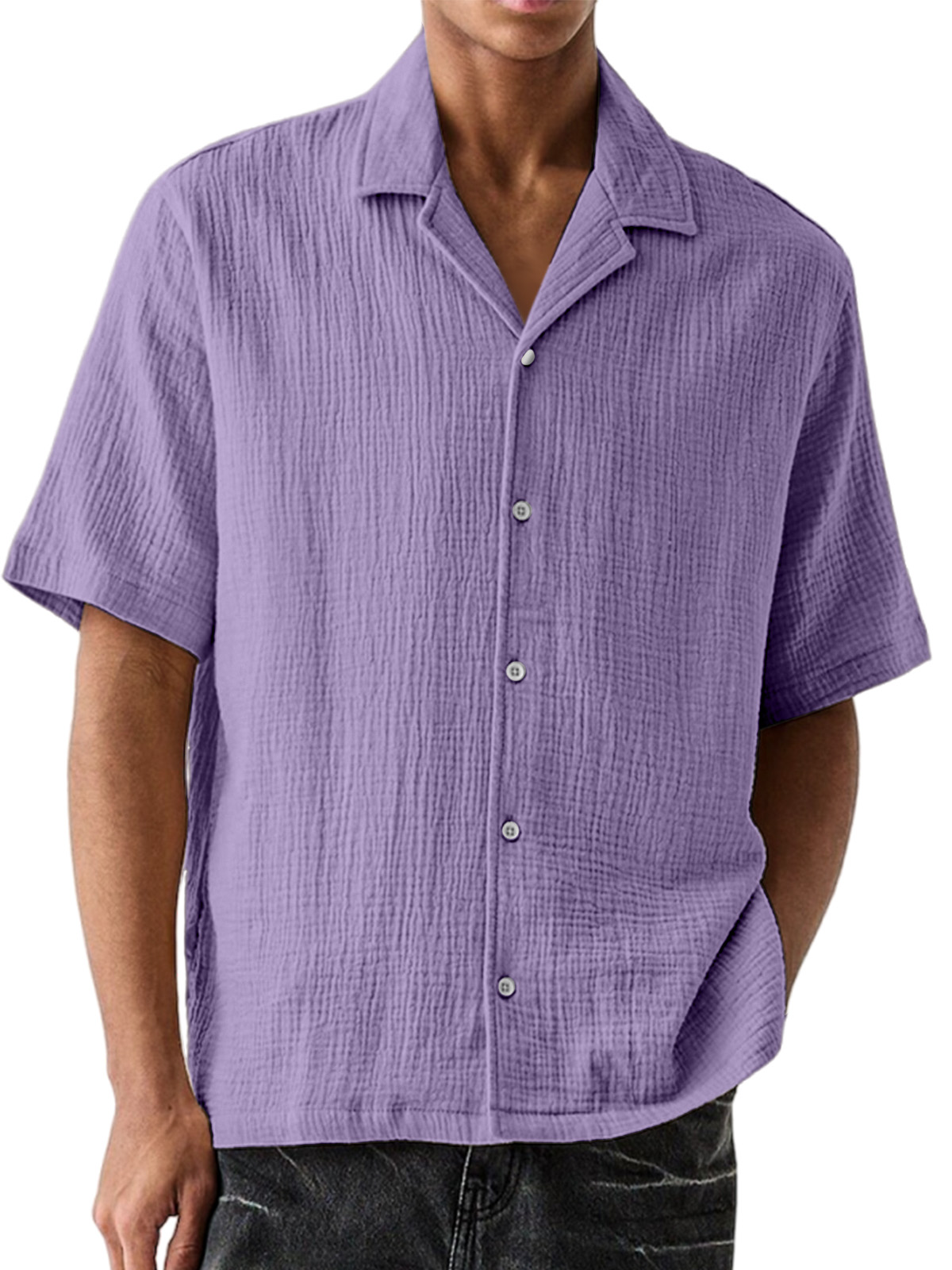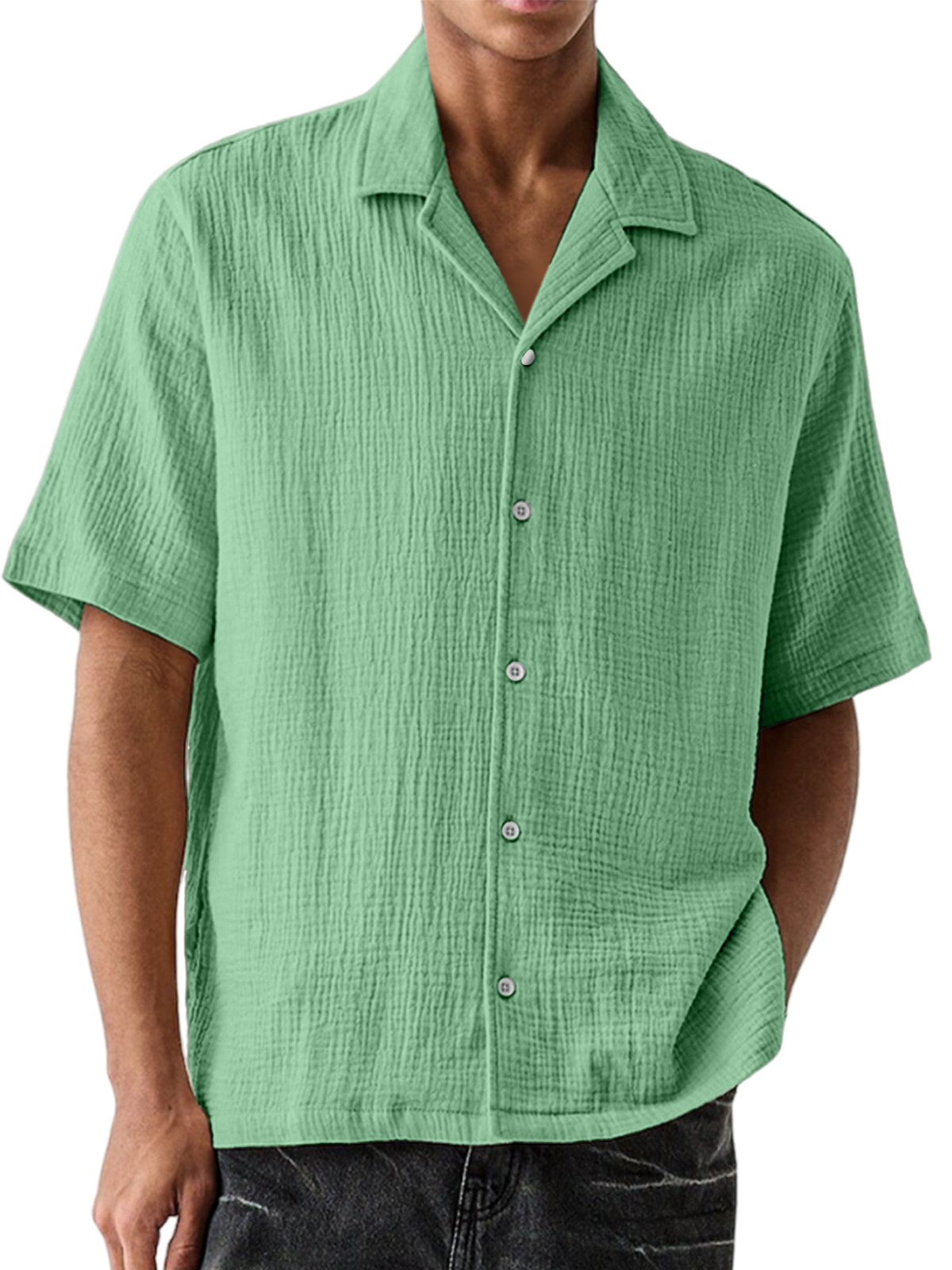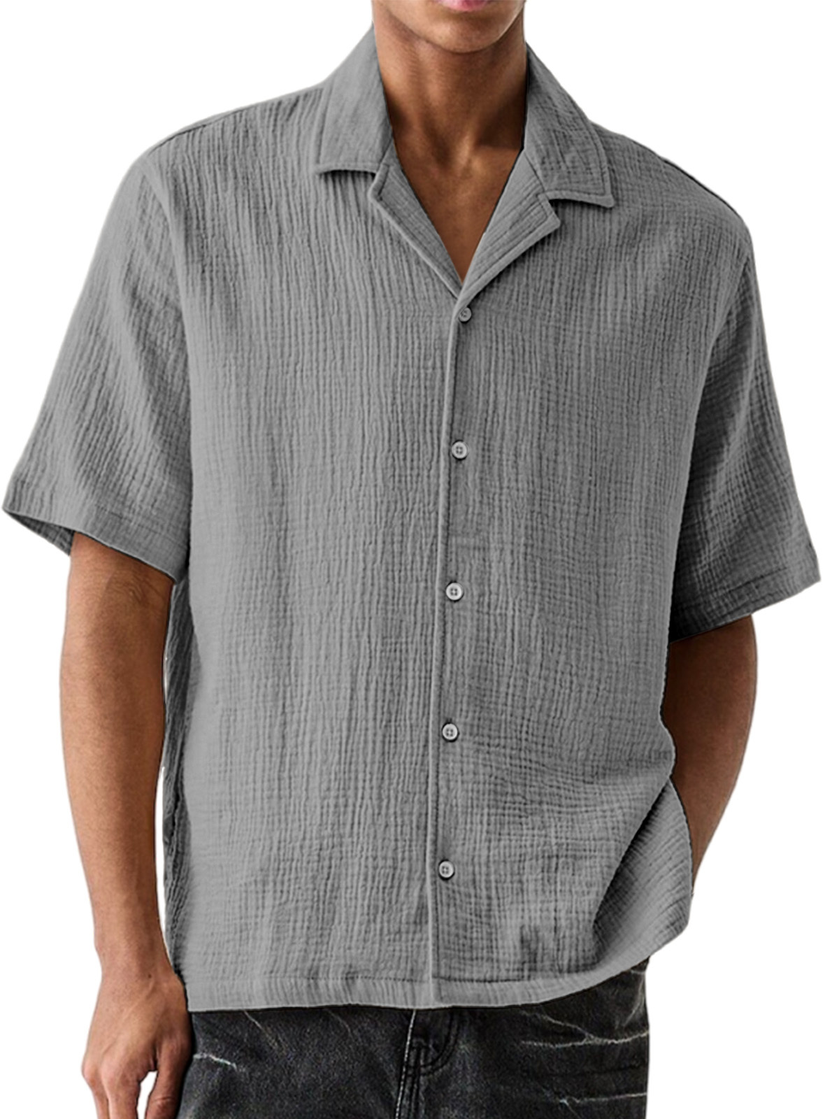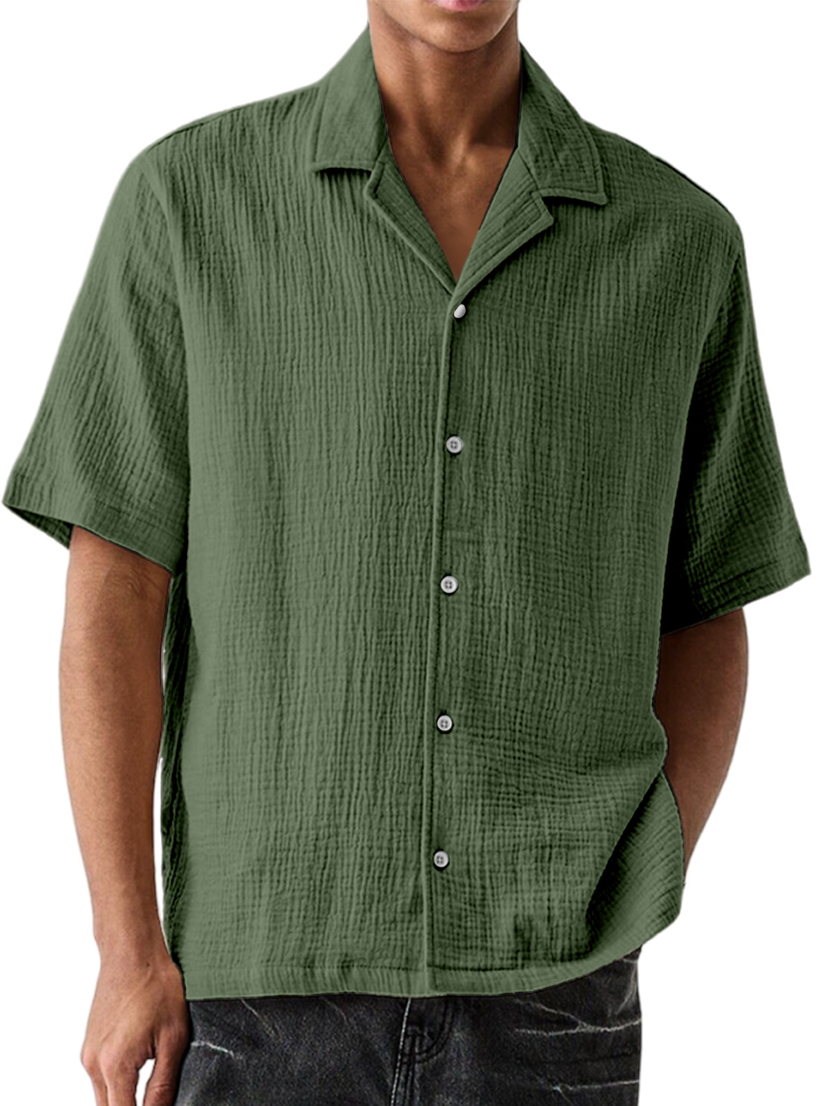 Men's Casual Solid Color Textured Cuban Collar Short-sleeved Shirt