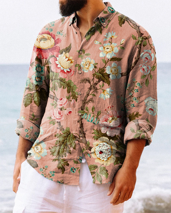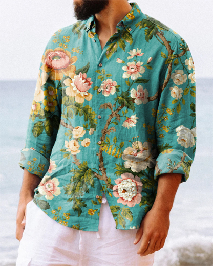 Men's Vintage Floral Print Button-Down Long Sleeve Casual Shirt