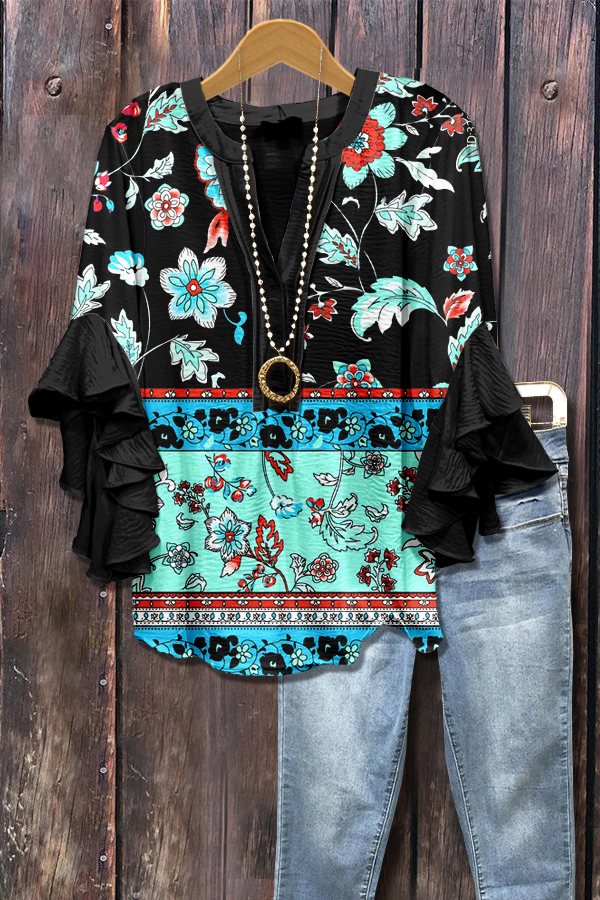 Multi Color Floral Print Ruffle Sleeve Top