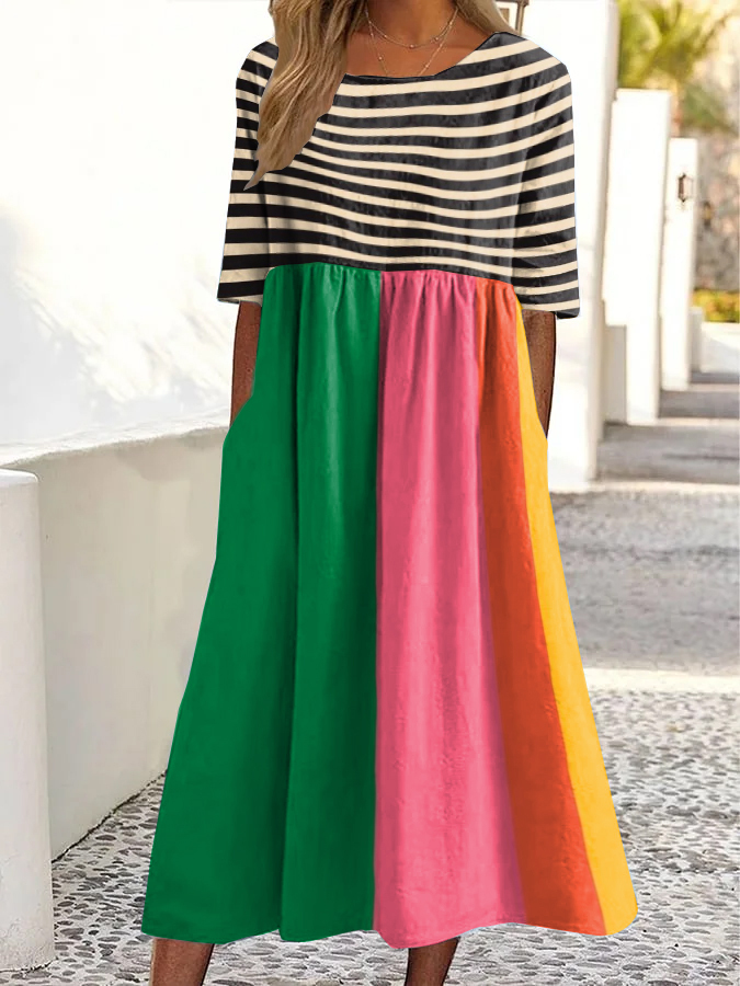 Retro Abstract Geometric Print Round Neck Pocket Midi Dress