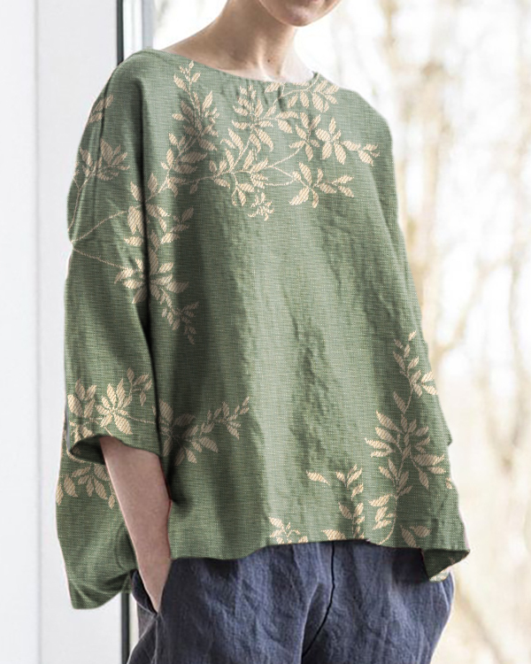 Vintage Floral Art Print Round Neck Cotton and Linen Loose Top