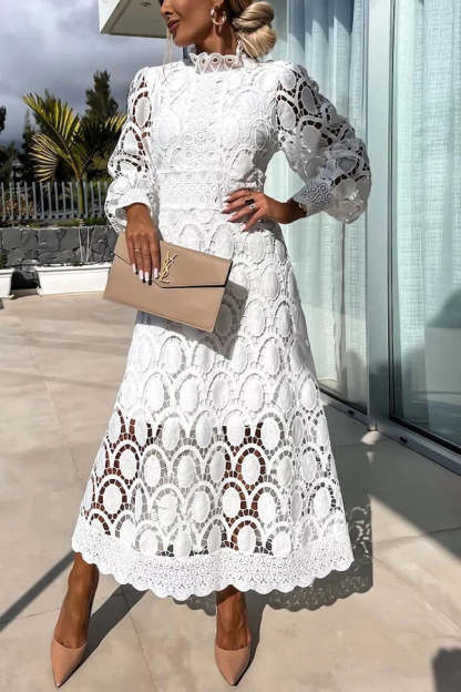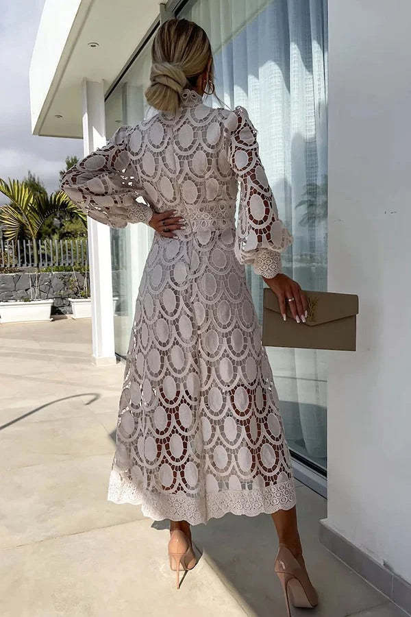Romantic, Sensual and Elegant Crochet Lace Lantern Sleeve Party Midi Dress