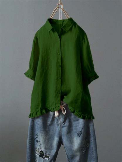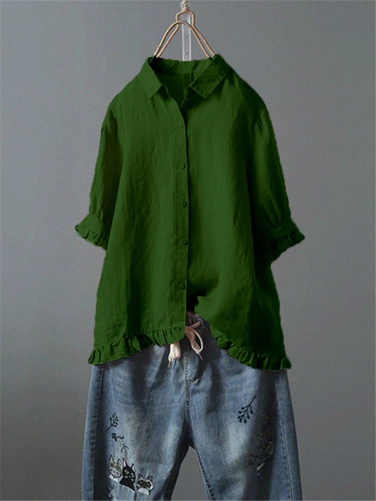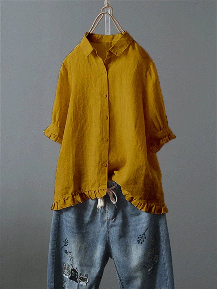 Solid Casual 3/4 Sleeve Turn-down Collar Tops