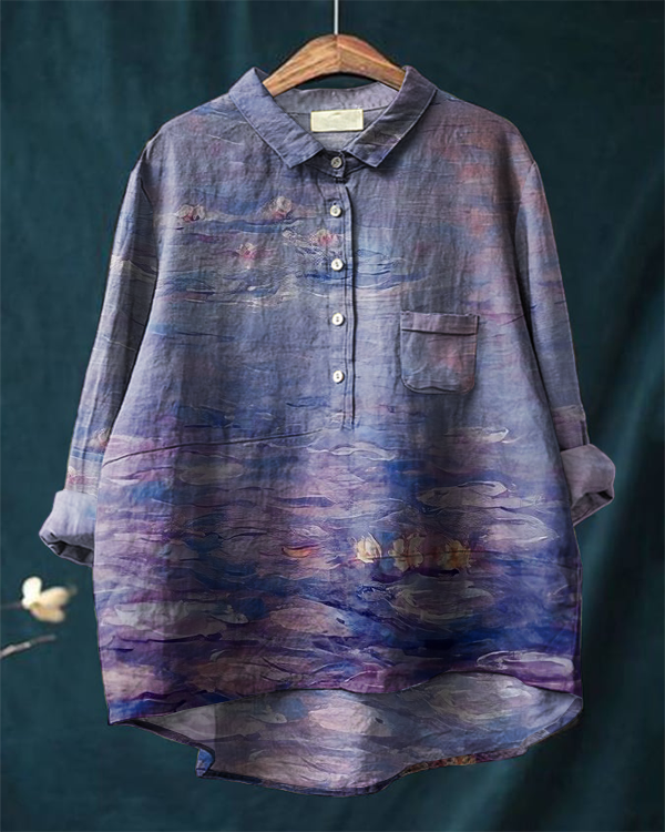 Vintage Art Water Lily Print Casual Cotton and Linen Shirt