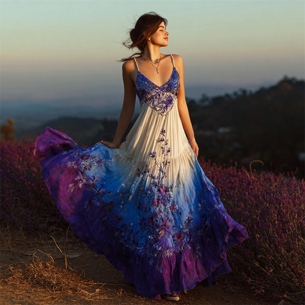 Vintage Boho Floral Gradient Embroidery Women's Spaghetti Strap Linen Maxi Dress