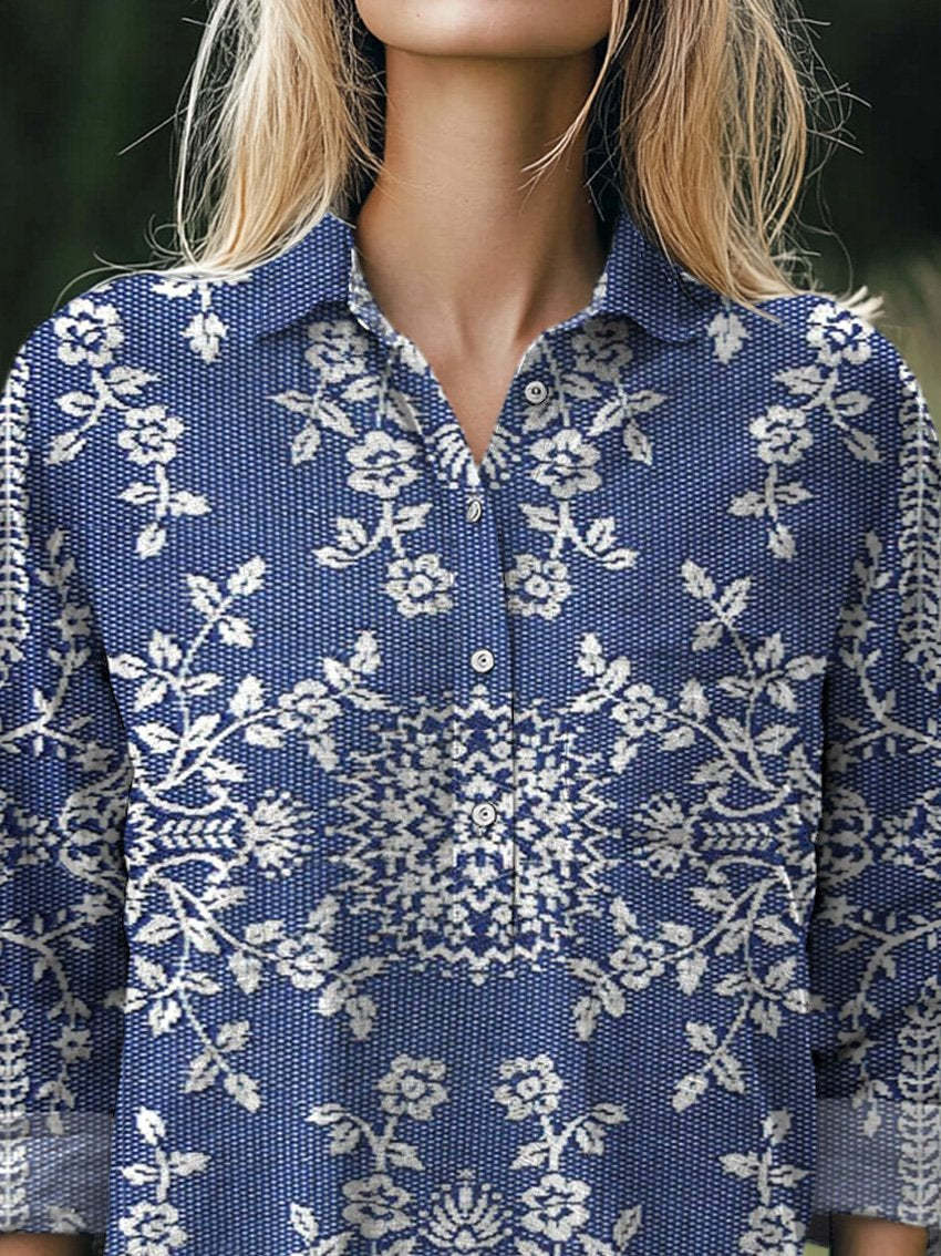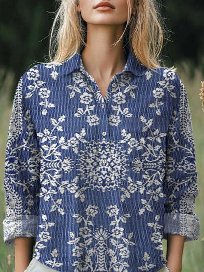 Vintage Floral Pattern Printed Women's Casual Cotton And Linen Shirt