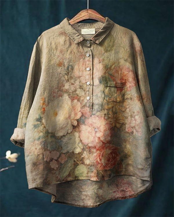 Vintage Floral Print Casual Cotton and Linen Shirt