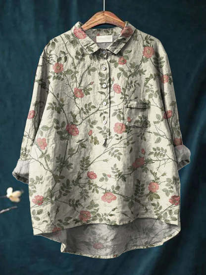 Vintage Style Pink Floral Repeat Pattern Printed Women's Casual Cotton And Linen Shirt