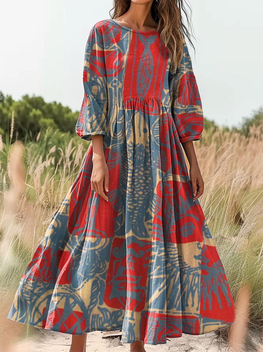 Women's Bohemian Ethnic Collage Art Pattern Print Flowy Cotton Crew Neck Dress