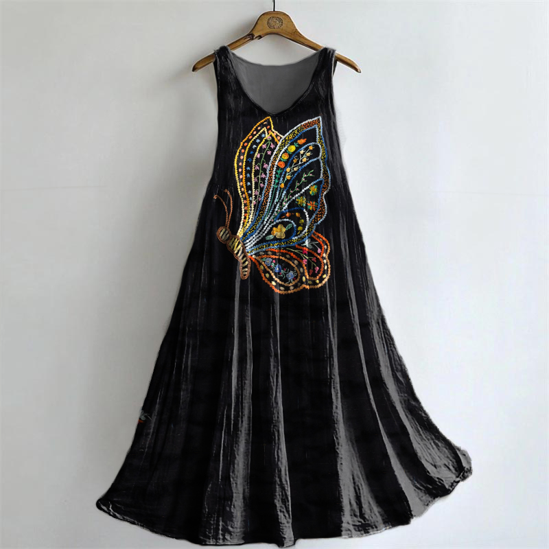 Women's Butterfly Pattern Art Print Round Neck Sleeveless Cotton Pocket Dress