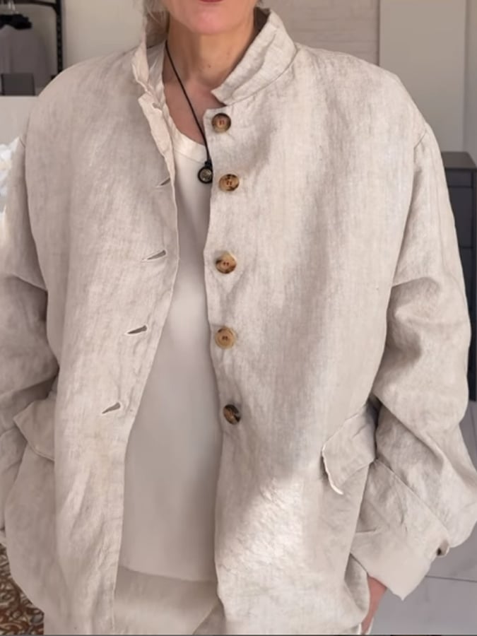 Women's Cotton And Linen Plain Casual Stand Collar Jacket
