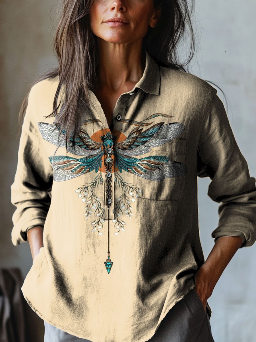 Women's Vintage Dragonfly Art Print Casual Cotton And Linen Shirt