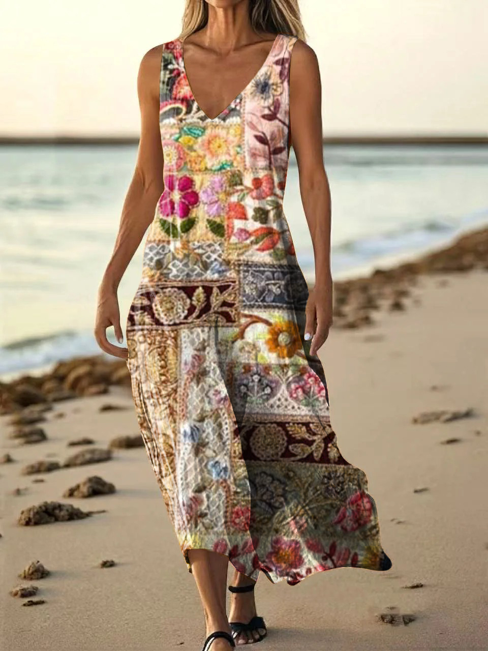 Women's Vintage Ethnic Floral Art Print Pocket Cotton Dress