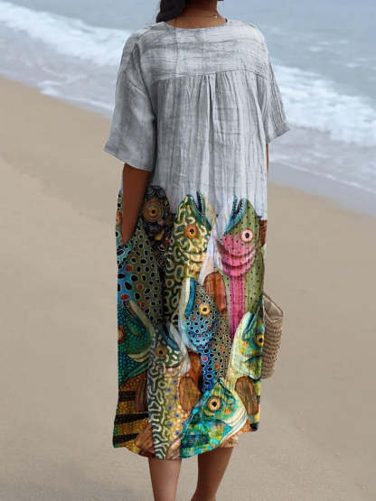 Women's Vintage Fish Art Print Flowy Dress