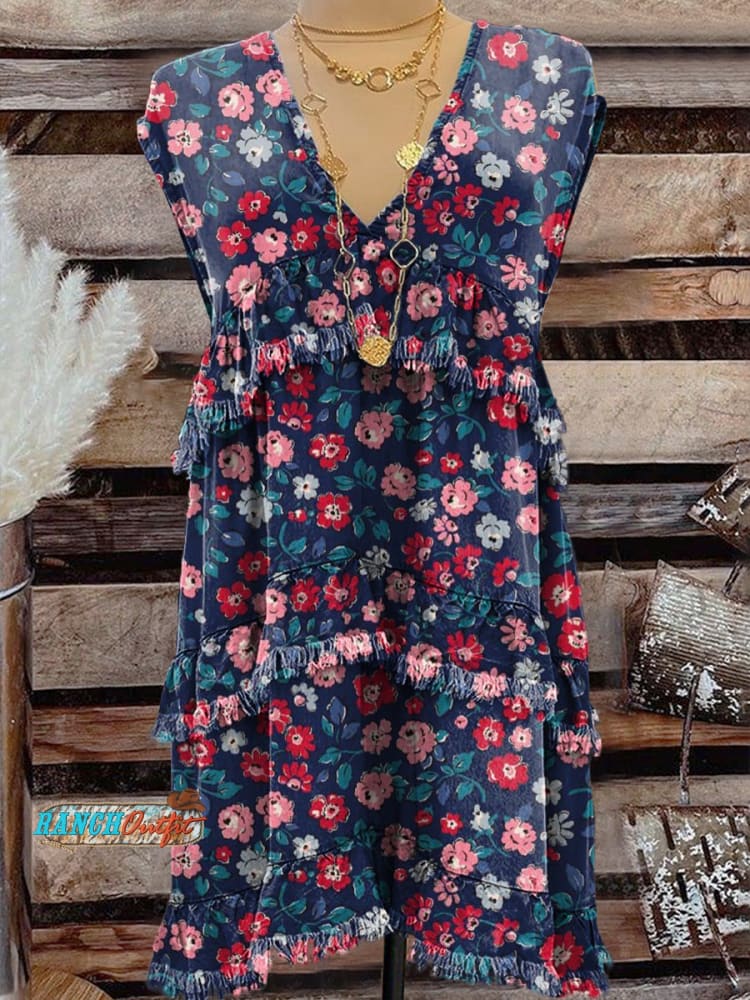 Women's Vintage Floral Art Print Denim Pocket Cotton Dress