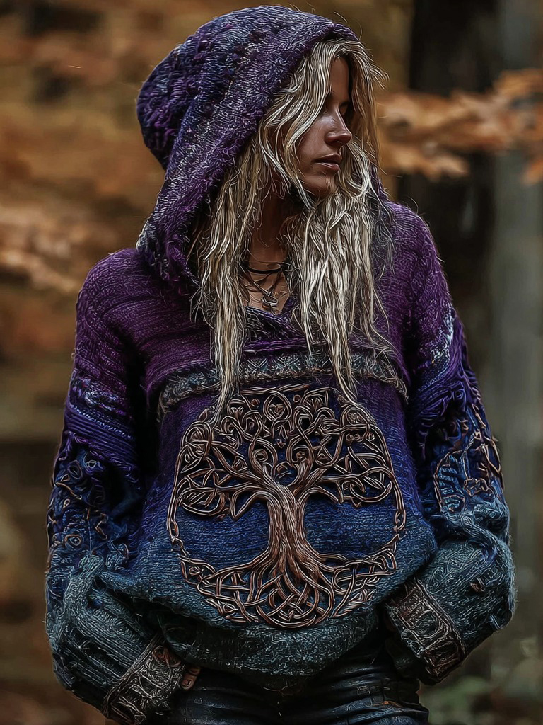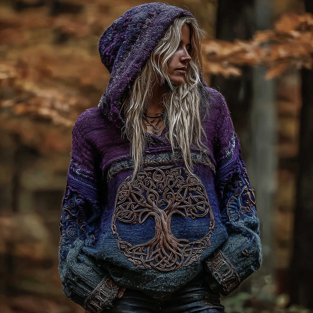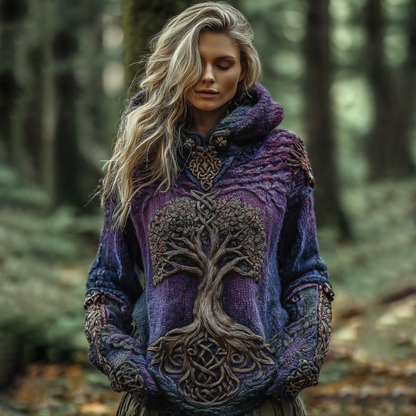 Women'sviking Celtic Knot With Tree Of Life Knitted Warm Hooded Sweater