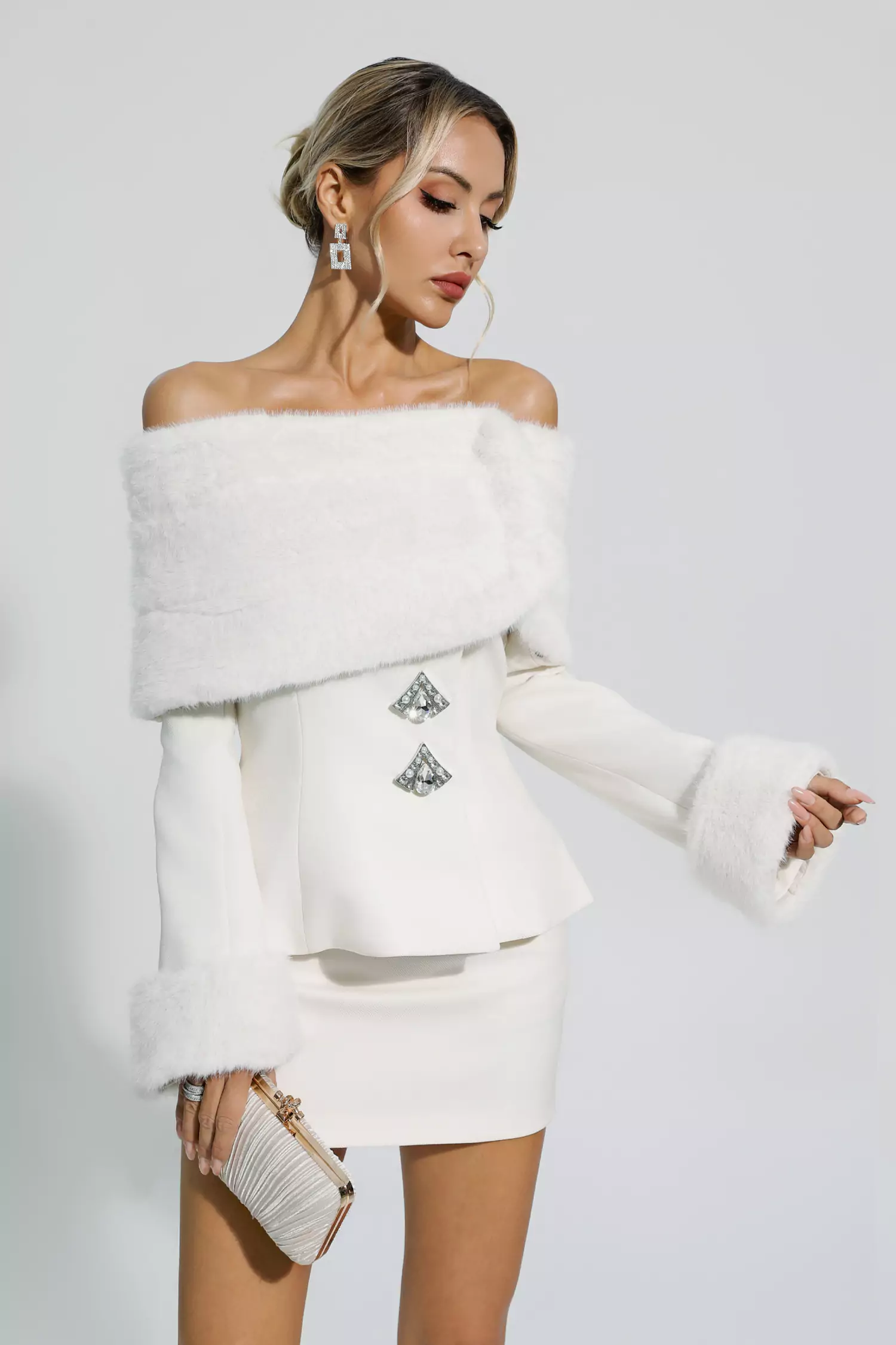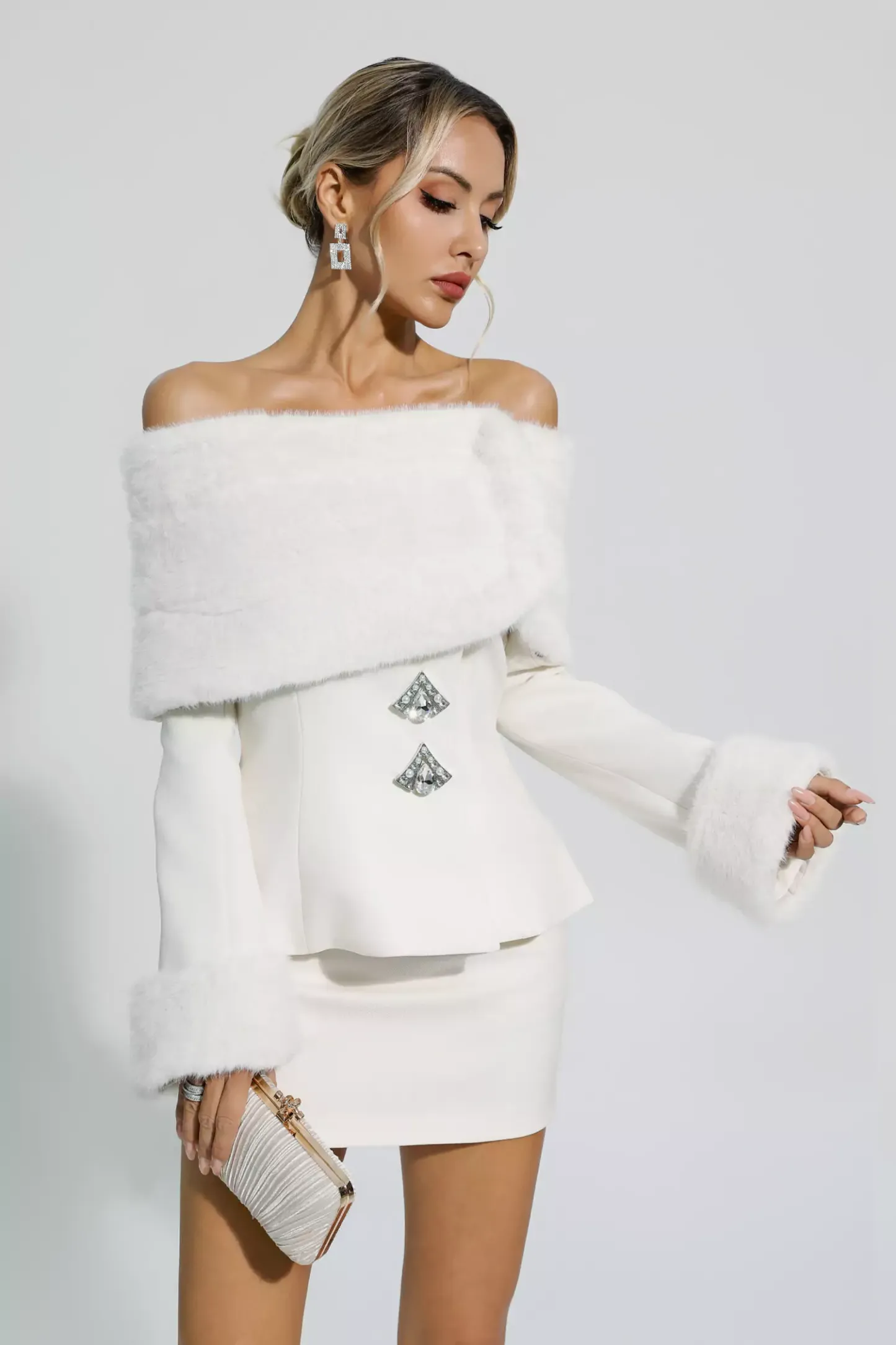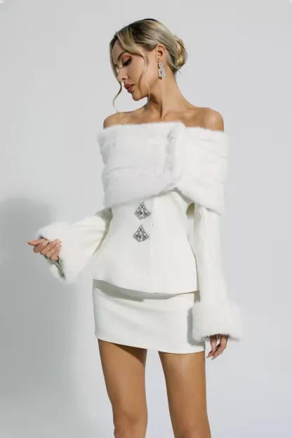 Elevate your style with the exquisite White Furry Coat Set. This two-piece ensemble features a one-shoulder jacket and a matching skirt, both crafted with luxurious imitation fur. Adorned with delicate rhinestones, this set exudes elegance and sophistication. Embrace comfort and glamour effortlessly with the Irene White Furry Coat Set.