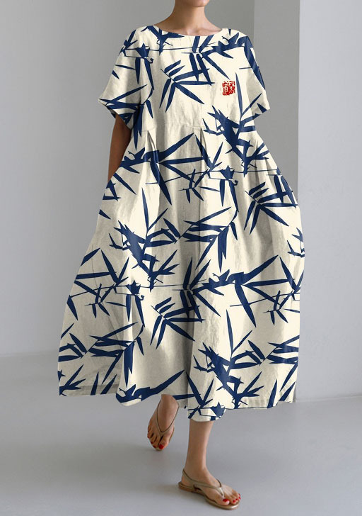 Japanese Bamboo Leaf Retro Short-sleeved Loose Mid-length Dress