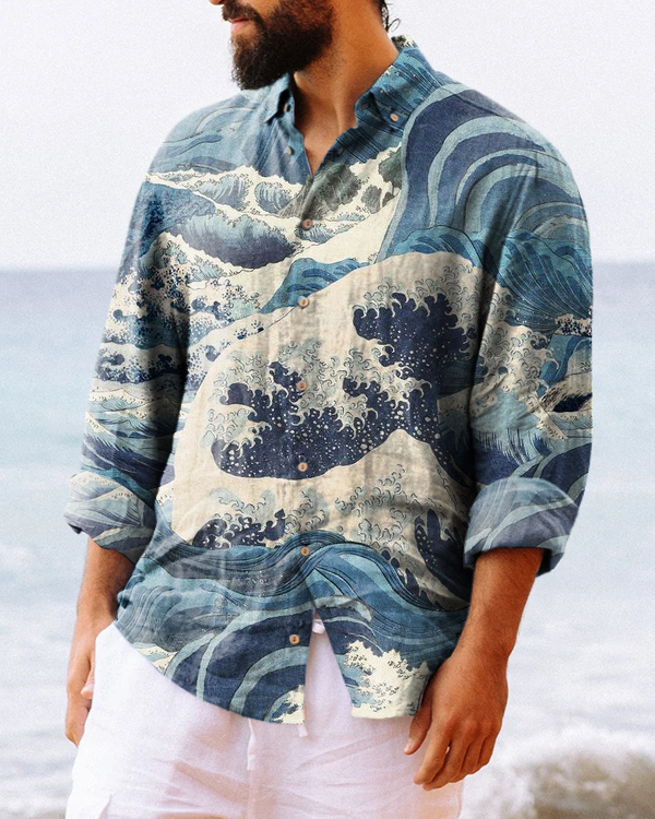 Men's Japanese Wave Print Button Long Sleeve Casual Shirt
