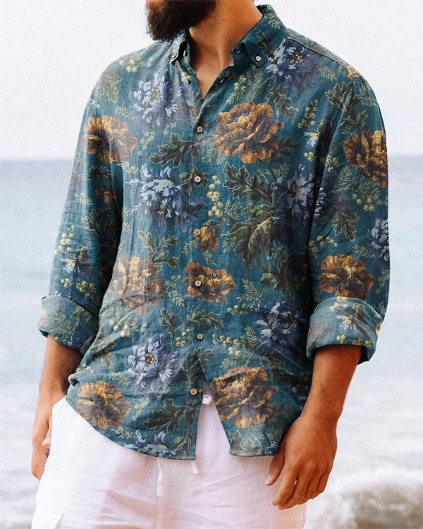 Men's Vintage Floral Print Button-Down Long Sleeve Casual Shirt
