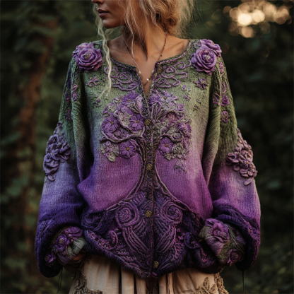 Purple Floral Tree Of Life Crochet Embroidered Gradient Cozy Cardigan