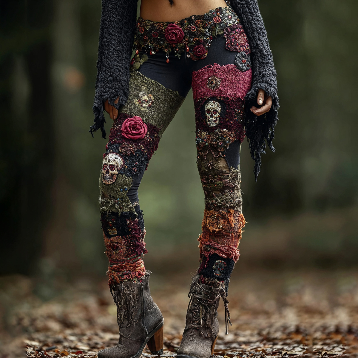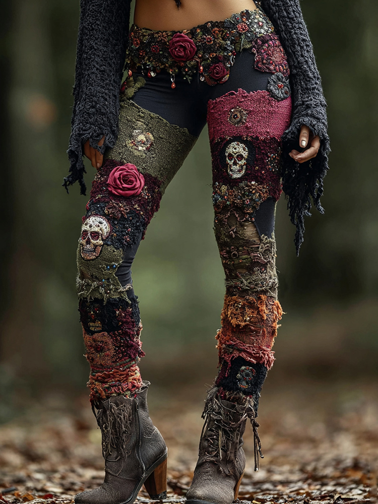 Rose Skull Gothic Patchwork Wool Print Leggings