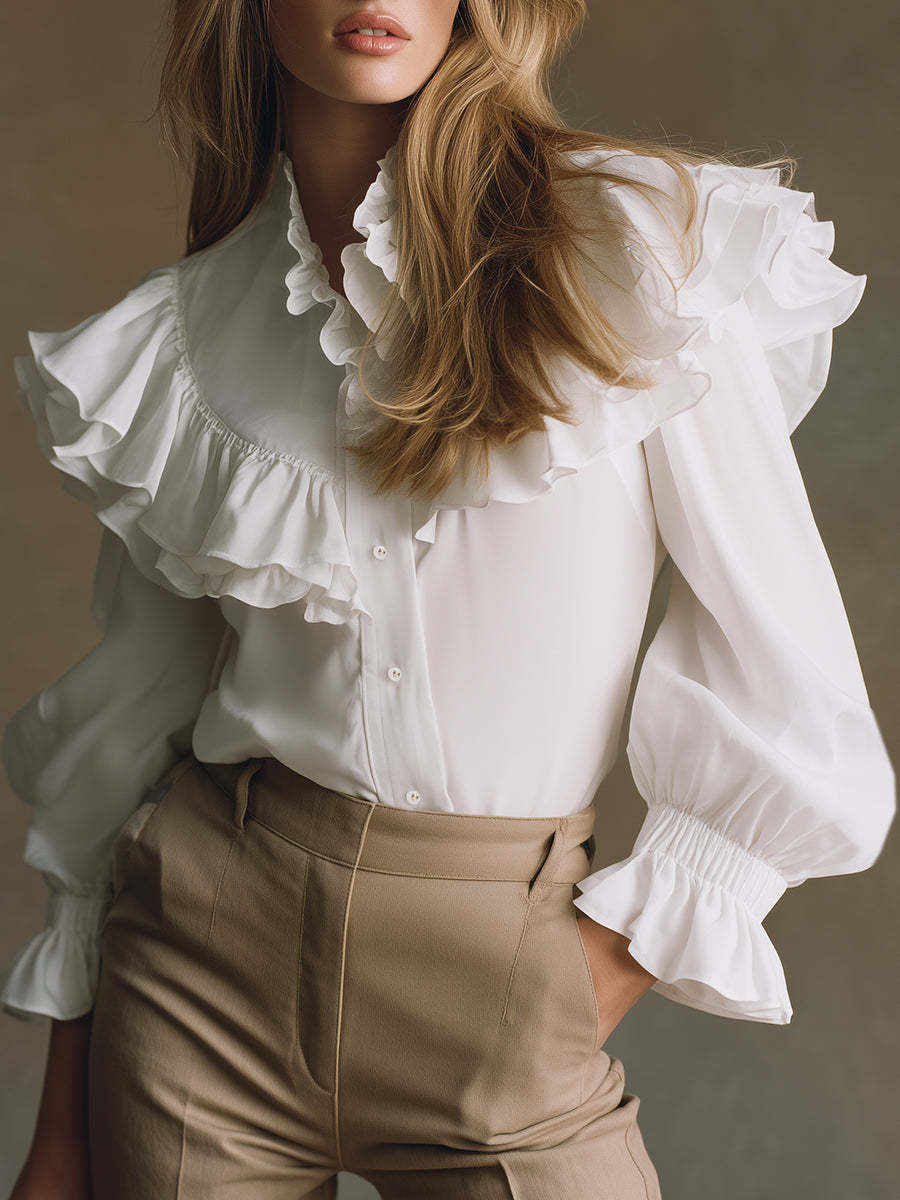 This exquisite white shirt stands out with its fashionable ruffled design, exuding elegance and suitable for various occasions. Whether it's a work meeting or a casual outing, this shirt effortlessly elevates your overall look.