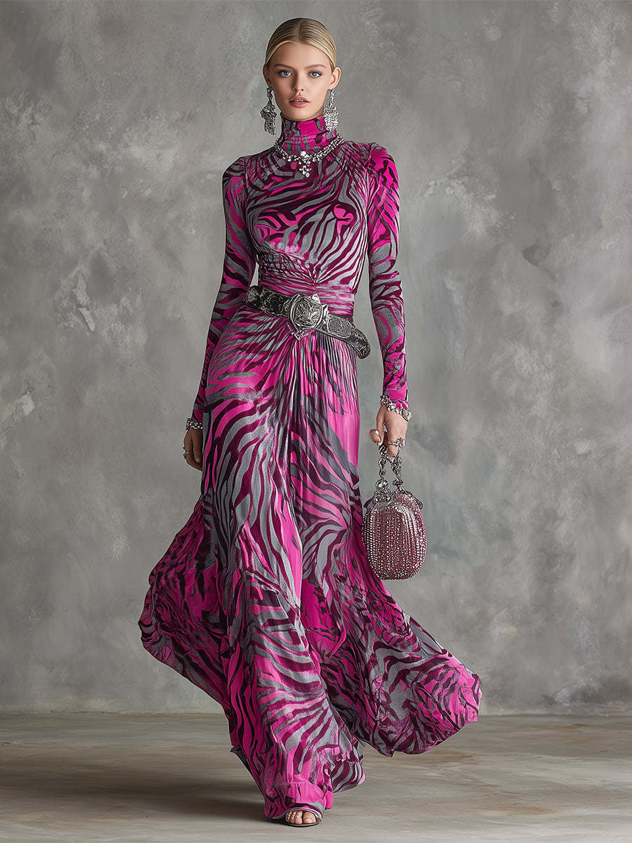 This stylish and eye-catching bright pink zebra-print velvet gown adds a vibrant touch to your wardrobe with its striking zebra pattern. The luxurious velvet fabric combines comfort and style, making it ideal for various important occasions.