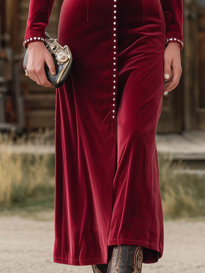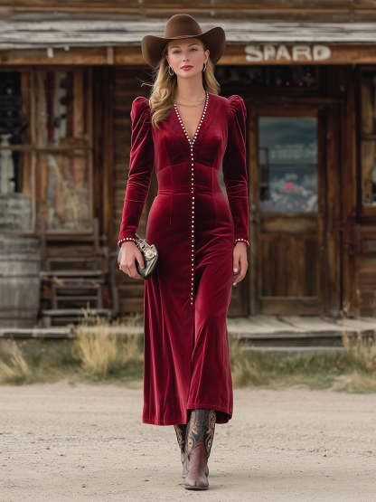 Western Red Velvet V-Neck Studded Midi Dress